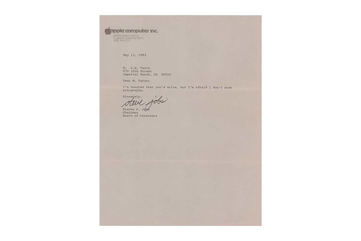 While historical Apple products have been preserved to tell the tale of how technology has advanced in the past few decades, there have been additional artifacts that have surfaced. A typed letter from Steve Jobs recently appeared on the chopping block. On a 8.5” x 11” paper, the letter has an Apple Computer Inc. letterhead that is dated back to May 11, 1983. The letter is addressed to L.N. Varon from Imperial Beach, California. The short letter sees Jobs responding to a request for an interview. He wrote, “I’m honored that you’d write, but I’m afraid I don’t sign autographs.”
