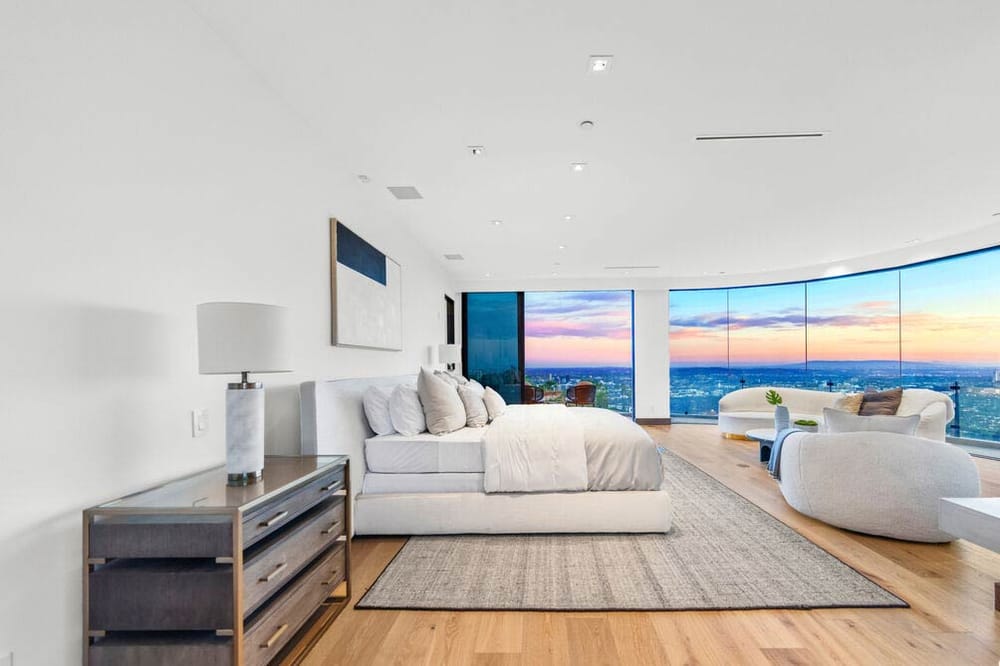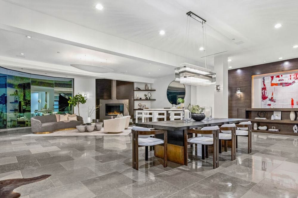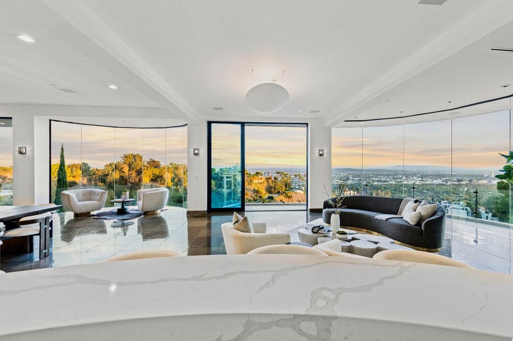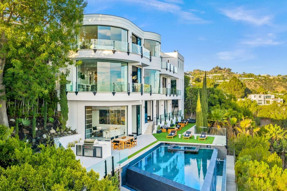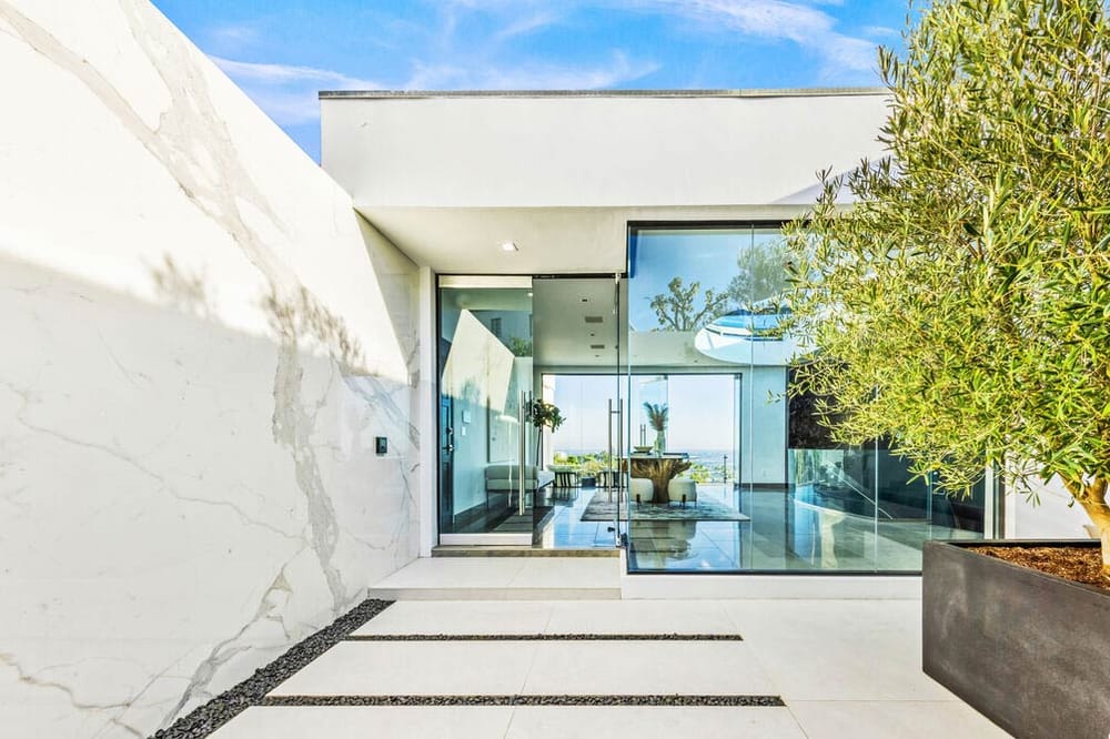 The luxury home is just minutes away from Sunset Blvd and the Beverly Hills Hotel, and features panoramic views from Downtown LA to the Pacific via massive windows and outdoor spaces. The home entrance sees an olive tree combined with a serene waterfall, where on the inside, the entire home is fitted with Crestron smart home technology. Amenities include two wet bars, three fireplaces, a grand patio with a garden, a private elevator, a grand staircase, a master suite with a Calacatta clad en-suite bathroom, a steam room, soaking tub, jacuzzi spa, heated infinity pool, and a private backyard.