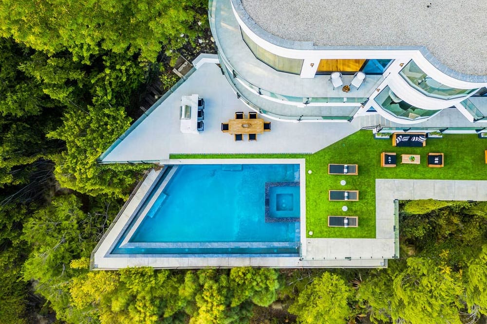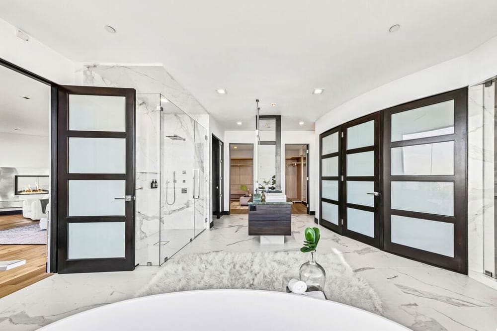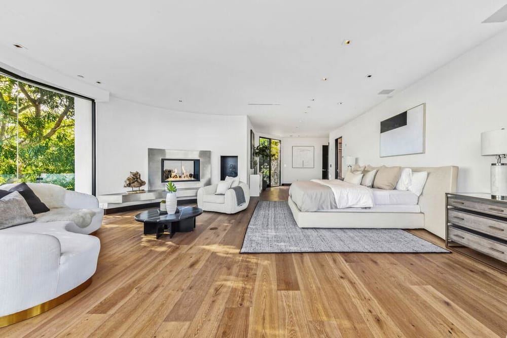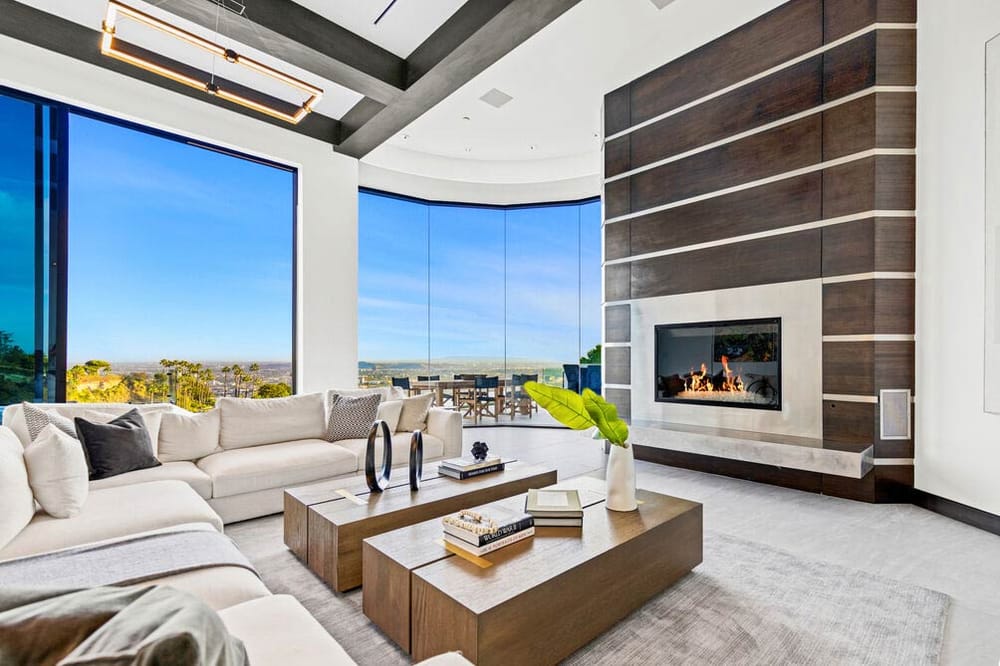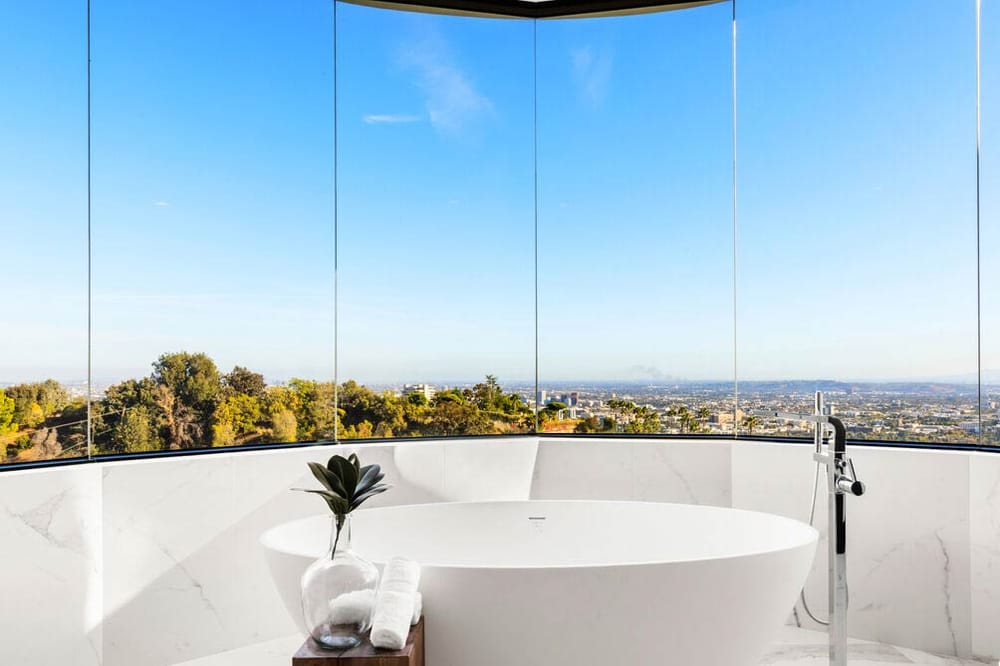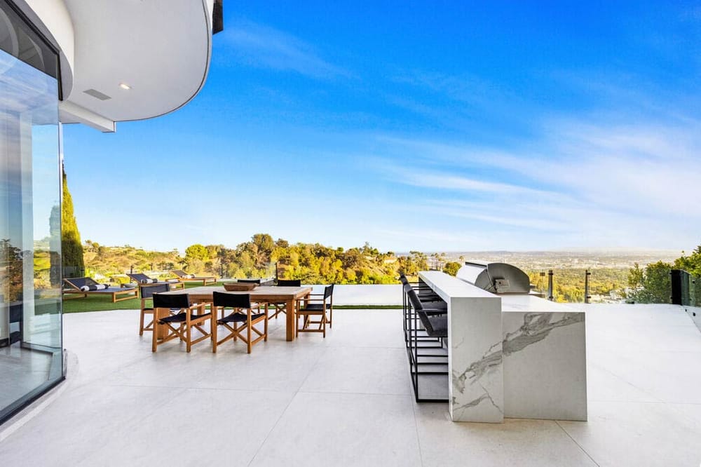 The luxury home is just minutes away from Sunset Blvd and the Beverly Hills Hotel, and features panoramic views from Downtown LA to the Pacific via massive windows and outdoor spaces. The home entrance sees an olive tree combined with a serene waterfall, where on the inside, the entire home is fitted with Crestron smart home technology. Amenities include two wet bars, three fireplaces, a grand patio with a garden, a private elevator, a grand staircase, a master suite with a Calacatta clad en-suite bathroom, a steam room, soaking tub, jacuzzi spa, heated infinity pool, and a private backyard.