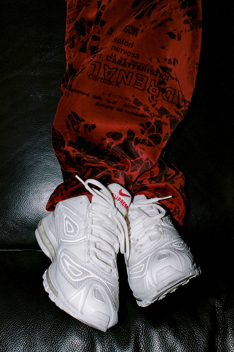 Branding on the shoe comes in the form of co-branding at the tongues, Swooshes at the sides, warped “SUPREME” text at the heels, Nike TL badges at the rear, and printed insoles. Elevating the uppers are foam midsoles assisted by full-length visible Air bags paired with matching rubber outsoles.