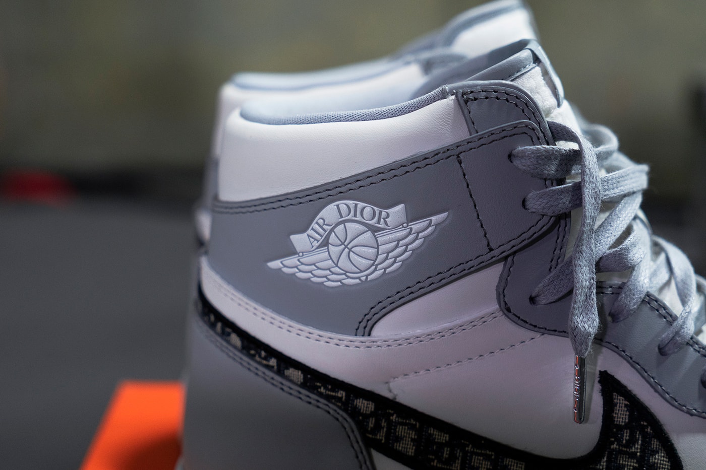Just in time for the AJ1’s 35th anniversary, the sneaker utilizes Dior’s expertise in leather goods and blends them with Nike’s sportswear aesthetics for a familiar look made with the highest level of quality and detail. The uppers feature one of Dior’s first shades (“Dior Grey,” an homage to the sky above Christian Dior’s childhood home) from 1947 painted across a number of panels, a remixed Dior Jumpman “Wings” logo, a co-branded “AIR DIOR” tongue tag, and a Nike Swoosh made from Dior’s Oblique motif.