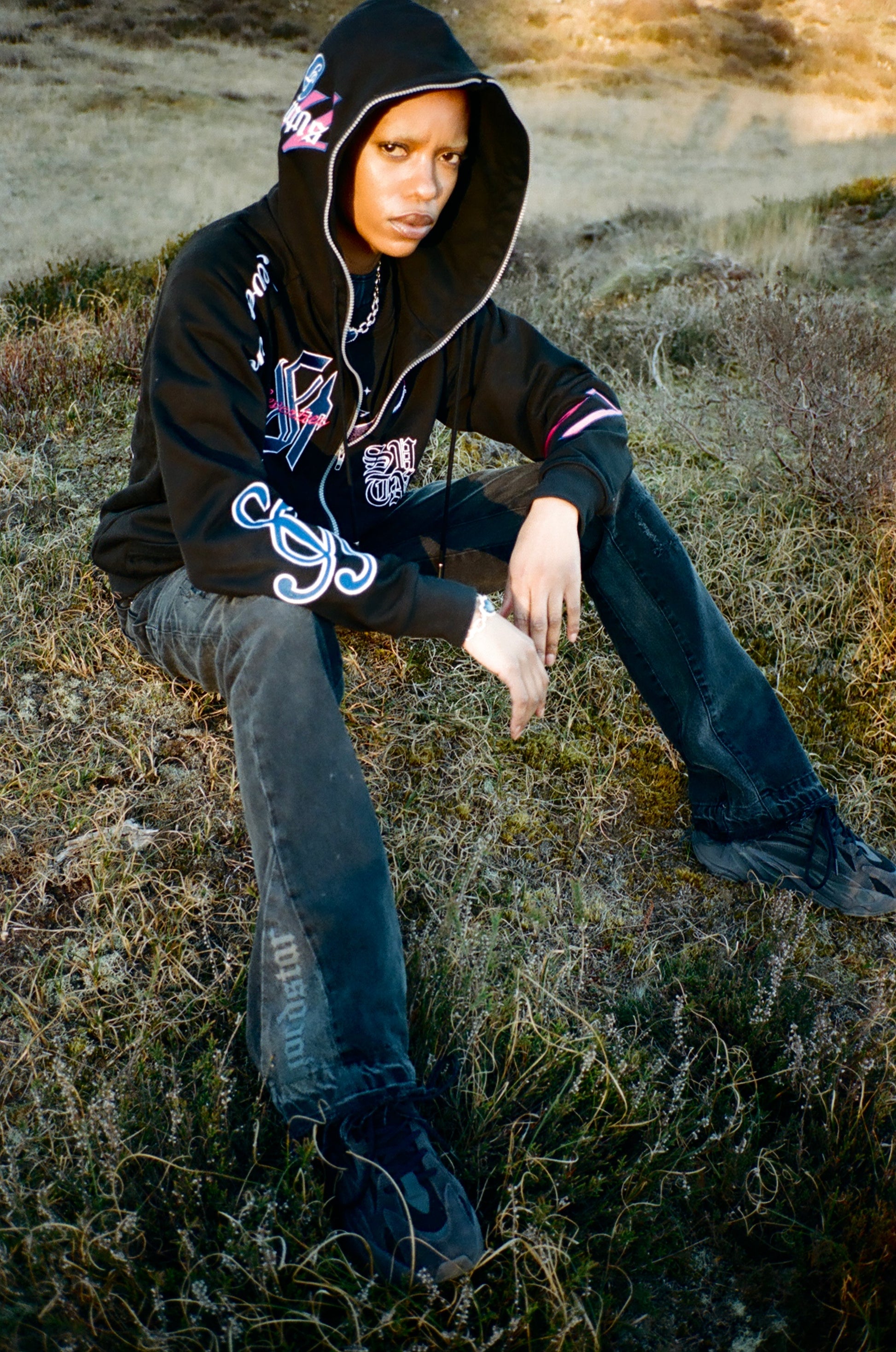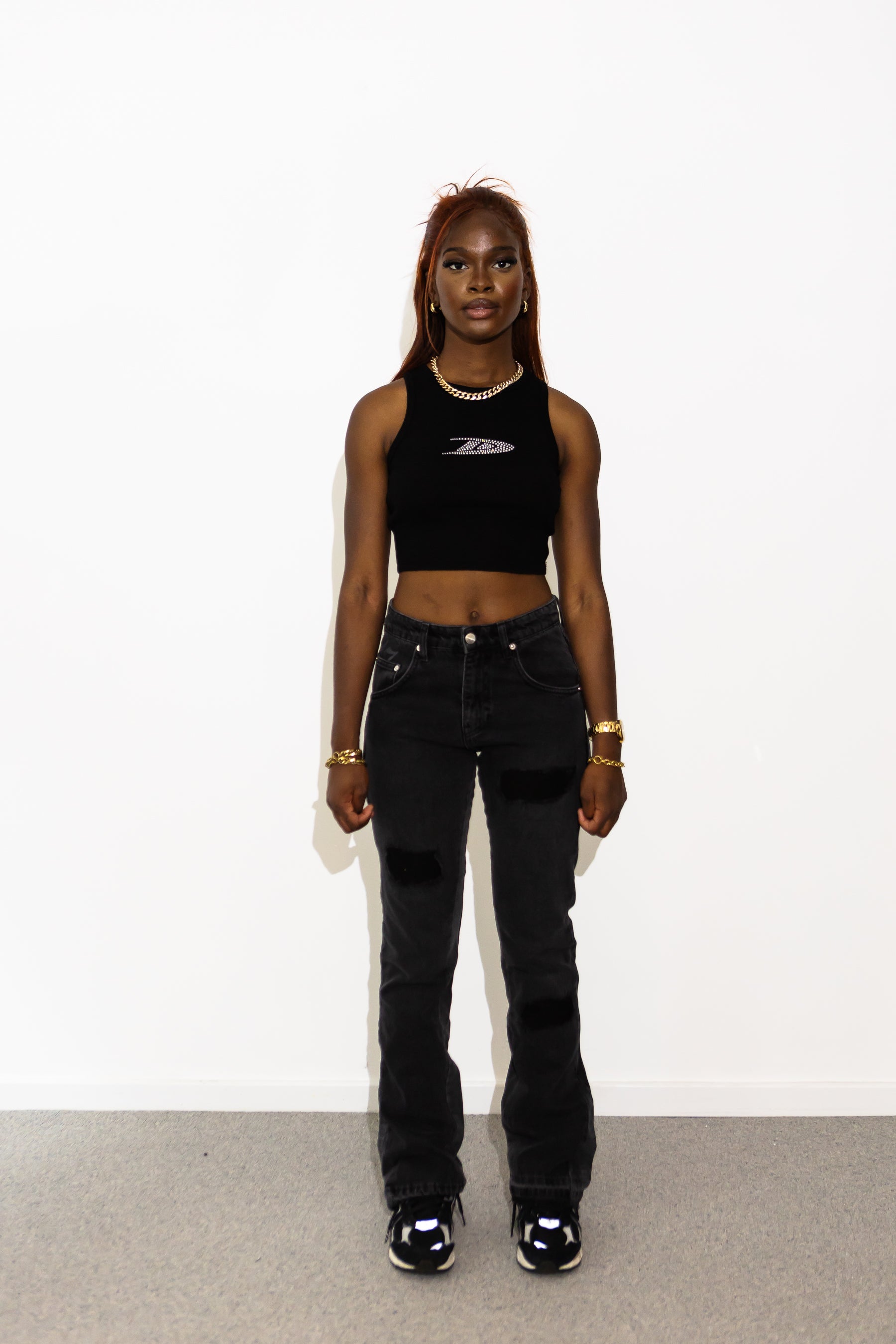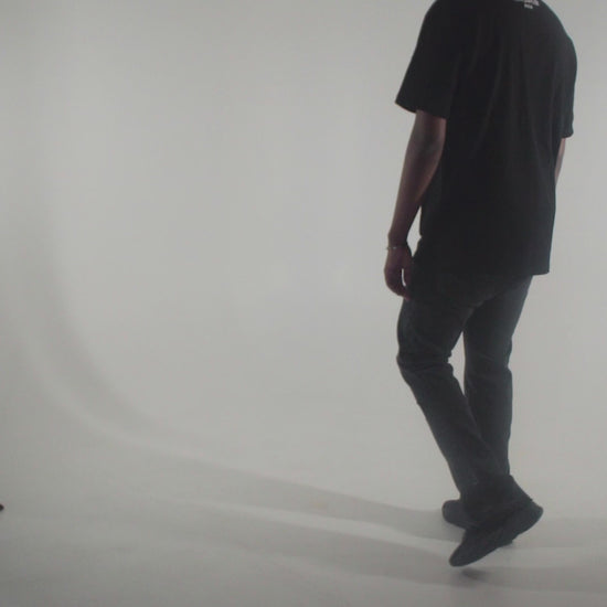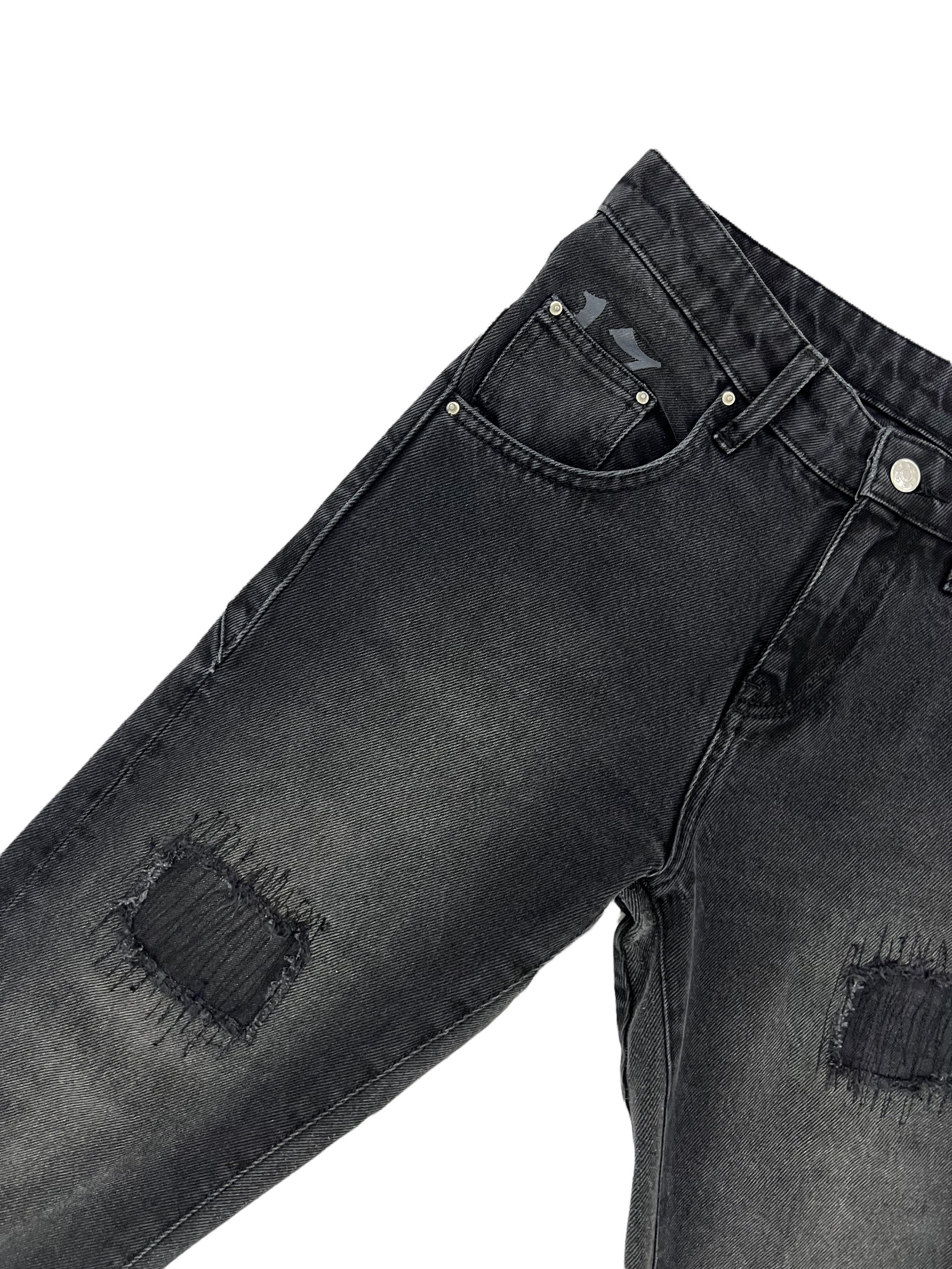 Premium quality flared cut jeans in black washed denim, with patchwork on the legs. Reworked pannel on the bottom for a subtile flare. The flare has "Hoodstar" ton sur ton print on the sides and logo print on the pockets and is 100% cotton.