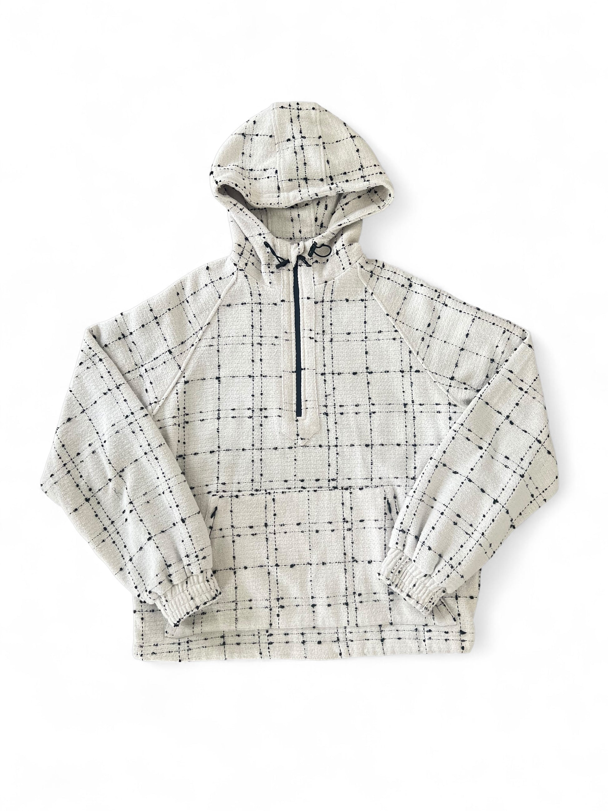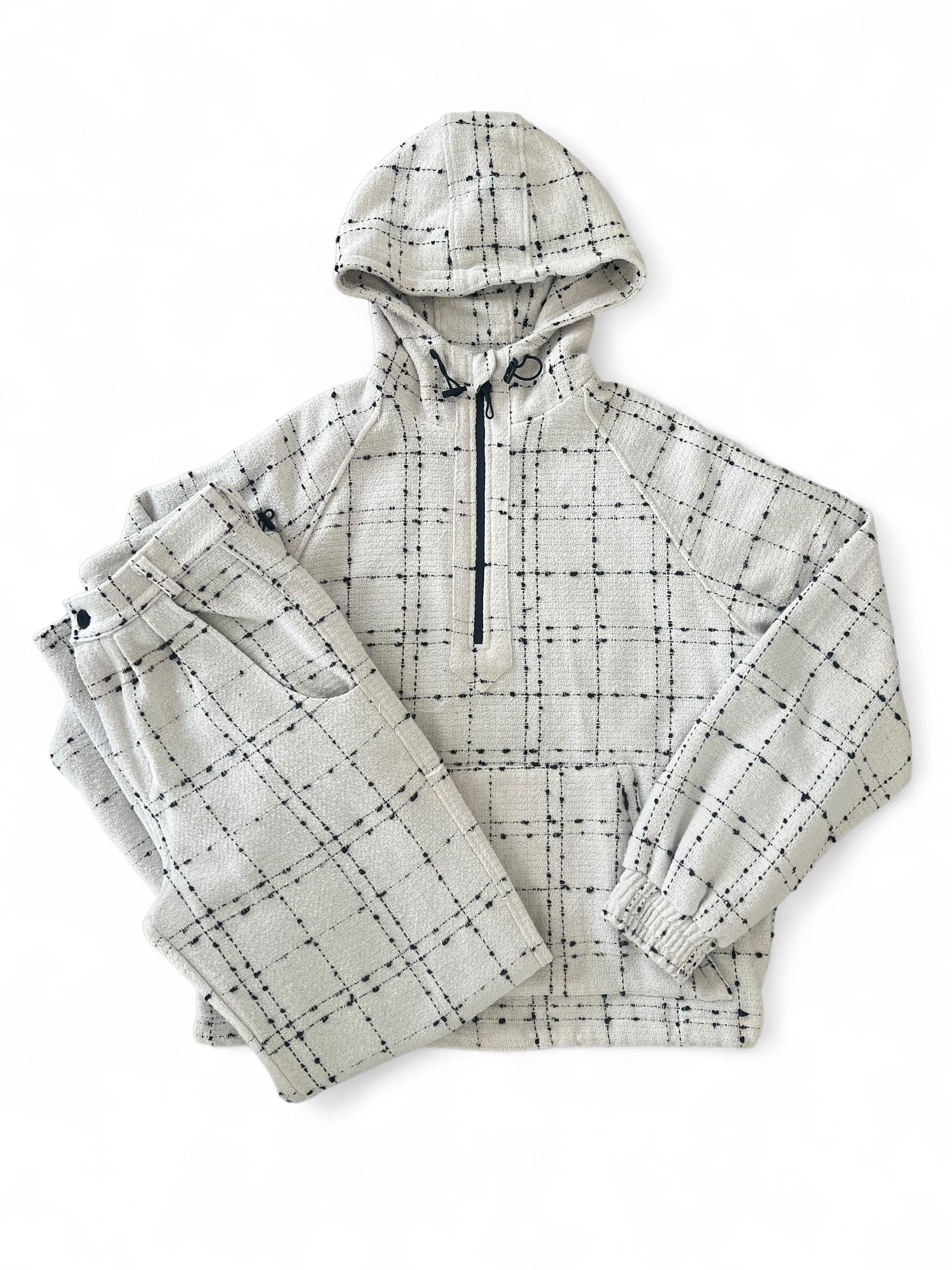 This versatile two-piece features a half-zip hoodie with adjustable hood and waist, complemented by hidden pocket zippers for sleek functionality. Soft cotton lining provides warmth and comfort throughout the day. The matching pants showcase pleats, button details, and practical pockets—including a back pocket with invisible zipper. Customize your silhouette with adjustable waist cords and hemline, allowing you to transition seamlessly between straight and relaxed fits. Perfect for layering or standalone wear.
